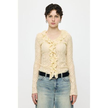 【LACE RUFFLE TOP/ レース ラッフルトップス】■ポイントフロントにあしらったリボンと繊細なフリルが目を引く、フェミニンムードたっぷりのレースラッフルトップス。甘さのあるデザインながら、コンパクトなシルエットで大人も取り入れやすい一枚です。■ディテール軽やかなレース素材を使用し、透け感と立体的なラッフルが上品な表情を演出。フロントリボンがさりげないアクセントとなり、華やかさをプラスします。■スタイリングデニムやスラックスと合わせて甘さを引き算したスタイリングがおすすめ。ジャケットのインナーとしても映え、コンパクトなバランスを活かした着こなしが楽しめます。■生地透け感:あり裏 地:なし伸縮性:なし光沢感:なし■商品のお気に入り登録お気に入りアイテムの再入荷・在庫1点などの通知を受け取ることができます。■ブランドのお気に入り登録新作アイテムの入荷や人気アイテムの再入荷、おすすめトピックスなど、いち早くブランドの情報を受け取ることができます。[注意事項]※画像の商品はサンプルです。実際の商品と仕様、加工が若干異なる場合があります。※画像の商品は光の照射や角度、お使いのモニター環境により、実物と色味が異なる場合がございます。※着用、お取り扱いの際は、アテンションタグをご確認ください。