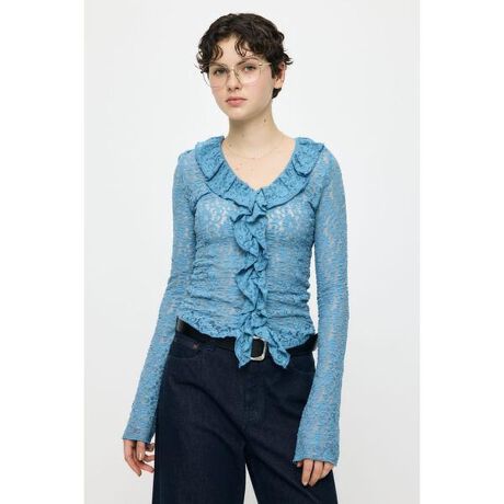 【LACE RUFFLE TOP/ レース ラッフルトップス】■ポイントフロントにあしらったリボンと繊細なフリルが目を引く、フェミニンムードたっぷりのレースラッフルトップス。甘さのあるデザインながら、コンパクトなシルエットで大人も取り入れやすい一枚です。■ディテール軽やかなレース素材を使用し、透け感と立体的なラッフルが上品な表情を演出。フロントリボンがさりげないアクセントとなり、華やかさをプラスします。■スタイリングデニムやスラックスと合わせて甘さを引き算したスタイリングがおすすめ。ジャケットのインナーとしても映え、コンパクトなバランスを活かした着こなしが楽しめます。■生地透け感:あり裏 地:なし伸縮性:なし光沢感:なし■商品のお気に入り登録お気に入りアイテムの再入荷・在庫1点などの通知を受け取ることができます。■ブランドのお気に入り登録新作アイテムの入荷や人気アイテムの再入荷、おすすめトピックスなど、いち早くブランドの情報を受け取ることができます。[注意事項]※画像の商品はサンプルです。実際の商品と仕様、加工が若干異なる場合があります。※画像の商品は光の照射や角度、お使いのモニター環境により、実物と色味が異なる場合がございます。※着用、お取り扱いの際は、アテンションタグをご確認ください。