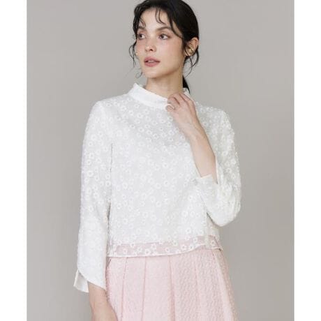 ■デザイン白×白の小さなフラワー刺繍を施したオーガンジーを贅沢に使い、華奢なスタンド衿で上品に仕上げたブラウス。袖口には特別なカーブを効かせたデザインを取り入れ、ボタンや細かなパーツに至るまで丁寧に作り込んだ一枚です。透明感のある素材感が抜け感を演出します。コーディネートの幅を広げてくれる、着映え力の高いブラウスです。■素材小花を全面に散りばめたエンブロイダリーレースとなります。基布にはワッシャー加工を施したオーガンジーを使用しており独特な表情と透明感が特徴的です。光沢を抑えた仕上がりに加え、刺繍糸は綿糸を使用することで柔らかさも感じる上品な仕上がりとなっております。生産から整理加工まですべて国内で丁寧に作ったファブリックです。・水洗い可・後ろファスナーあり■サンプル撮影商品画像の商品はサンプルです。実際の商品とはサイズや色味、素材、デザイン等の仕様が若干変更になる場合がございます。■カラーについては、可能な限り実際の商品に近いカラーにて撮影をおこなっておりますが、照明の関係により実際の製品とは色味が違って見える場合があります。またパソコン・スマートフォンなどの環境により、若干製品と画像のカラーが異なる場合もございます。現物と画像のカラー差異については返品理由となりませんので、予めご了承ください。■サイズ表記はあくまで目安となります。