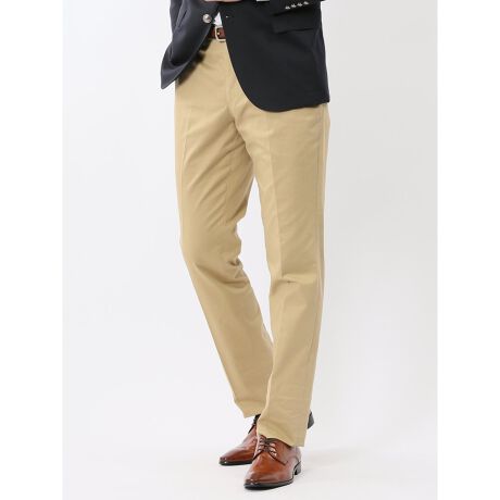 すっきりとしたノータックのテーパードパンツです。センタープレス加工、フロントファスナー・ボタン・ホック式、ベルト通し付き、前後ポケット付き、裾部分は未加工です。