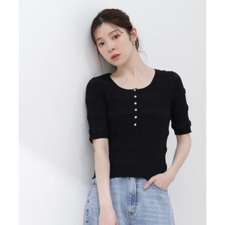 リブと立体感のある編地を組み合わせた、シンプルながら一枚で着映える変形リブニット。小さなボタン付きのヘンリーネックがさりげない可愛さをプラス。コンパクトなシルエットなのでルーズなボトムスとも相性良く着用いただけます。