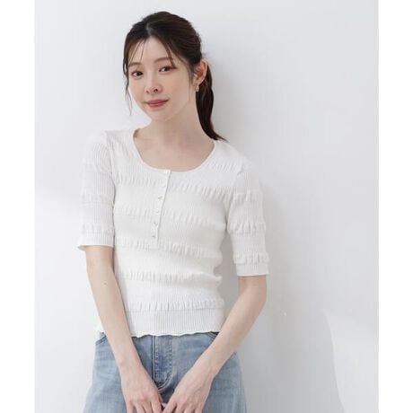 リブと立体感のある編地を組み合わせた、シンプルながら一枚で着映える変形リブニット。小さなボタン付きのヘンリーネックがさりげない可愛さをプラス。コンパクトなシルエットなのでルーズなボトムスとも相性良く着用いただけます。