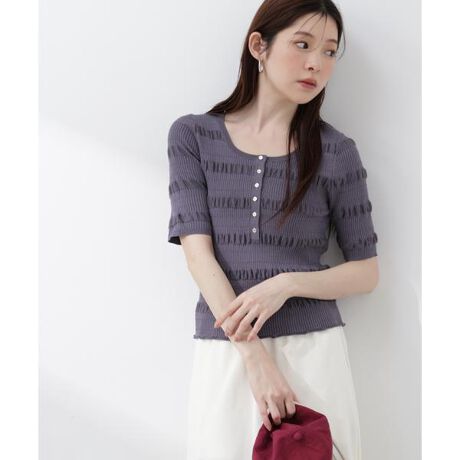 リブと立体感のある編地を組み合わせた、シンプルながら一枚で着映える変形リブニット。小さなボタン付きのヘンリーネックがさりげない可愛さをプラス。コンパクトなシルエットなのでルーズなボトムスとも相性良く着用いただけます。