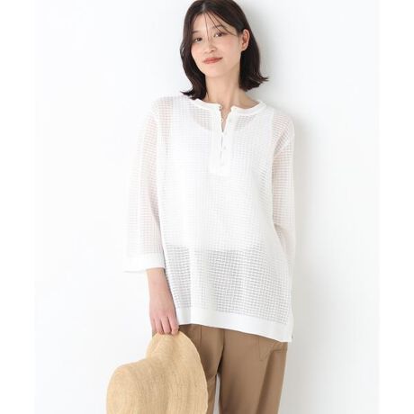 細かいチェック柄を連想する地柄が楽しいシアーチェックのチュニックプルオーバーです。カフタン型のゆったりシルエットでリラックス感があります。