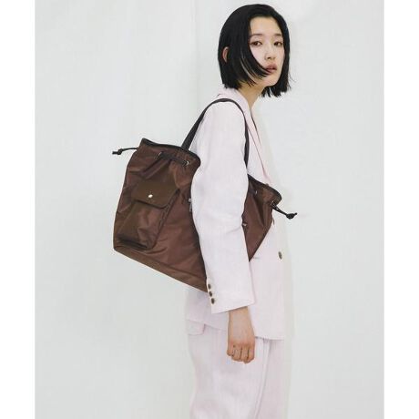 特徴的なフロントポケットは、小物の整理に便利なだけでなく、コーディネートの程よいアクセントに。コードを絞れば丸みのある巾着フォルムに、広げればトートバッグ風にと、その日の気分や荷物の量に合わせてシルエットを変えられます。