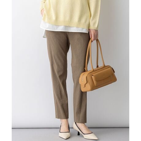 リネン混ならではの清涼感と、動きやすいストレッチ性を両立した、夏に欠かせないテーパードパンツです。フロントはファスナー開きとベルトループを施した本格的な仕様ですっきりとした印象を与えつつ、ウエストの後ろ部分はゴム仕様にすることで、締め付け感のない快適な穿き心地に仕上げました。ヒールを合わせても裾がもたつかない絶妙な丈感で、足元を軽やかに演出します。同素材のジャケットと合わせたセットアップスタイルなら、オフィスシーンにも最適。Tシャツやブラウスと合わせれば、大人のリラックスカジュアルも楽しめます。カラーは、着回しの効くオフ(#001)・ブラック(#005)・ネイビー(#075)のベーシックカラーに加え、ニュアンスのあるサンド(#033)・モカ(#030)・ダークブラウン(#035)、着こなしのアクセントになるキャロット(#020)・グレイッシュブルー(#070)の全8色展開です。