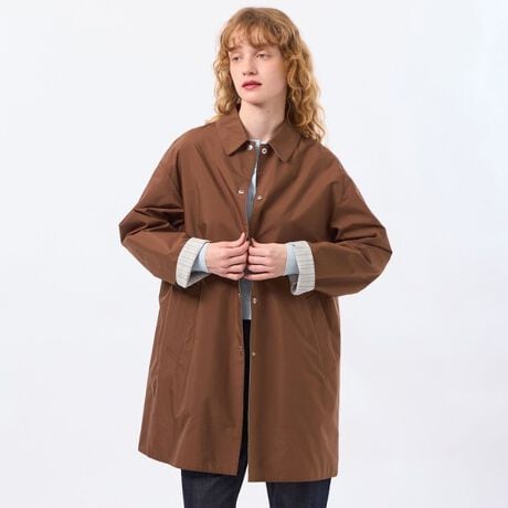 無地面とチェック面で羽織れる、リバーシブルのステンカラーコート。