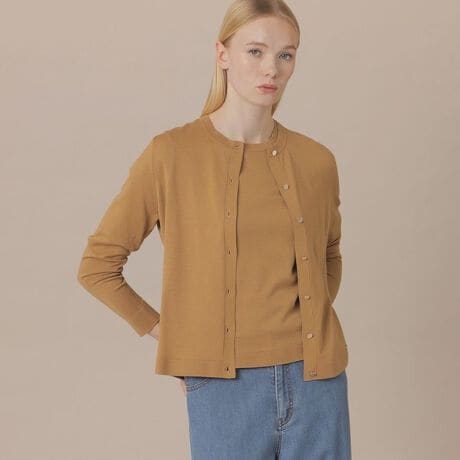 18ゲージの手横機を使用したニットです。18ゲージのニットは高い技術と時間が必要で、低速で一枚一枚丁寧に編み立てて作られています。袖口・裾をミラノリブ始末にし、体から程よく離れるシルエットを作り品の良い印象のカーディガンです。袖付けのラインが、前はセットイン後ろはラグランのスプリットラグランになっているので、スッキリしたシルエットながら、肩回りが動きやすいデザインになっています。同素材のプルオーバー(品番:G5N02700)とアンサンブルで着用していただけます。
