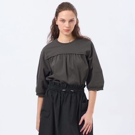 一枚でサマになるフロントギャザーのプルオーバー。ショルダーラインがなだらかで、リラックス感がありながらも、きれいめなポンチジャージー素材で上品な印象に。