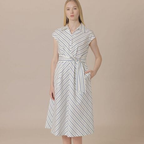 [型番:G5J22776__]【着用推奨シーズン:春・夏】<素材説明>イタリアFAbRICA(ファブリカ)社の素材を使用しています。細番手のコットン素材にシルクを打ち込み光沢感と軽さを兼ね備えた生地です。<デザインポイント>ウエストにタックで立体感を持たせ、ストライプをバイアス使いしたデザインとステンカラーが、シャープでクリーンな印象のワンピースです。裏地なし、アンダースカート付きです。