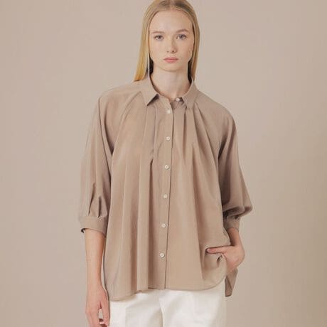 たっぷりタックを寄せてAラインに広がるチュニック丈のブラウスです。ヒップまでカバーできる便利な着丈で一枚でさまになり、カジュアルからエレガントスタイルまで幅広く活躍するアイテムです。