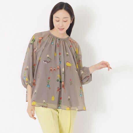 襟元のすっきりとしたデザインに、袖へたっぷりと寄せたギャザーが印象的なスリーブコンシャスブラウス。