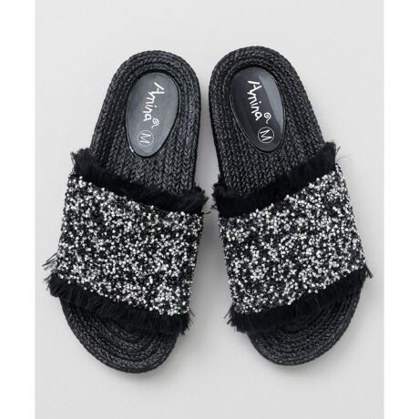 [型番:CSYP6107-2026]ラメとフリンジが印象的なスライドサンダル。編み込み風ソールがナチュラル感を演出し、足元に遊び心をプラス。リラックスした日にもこだわりを添える一足。