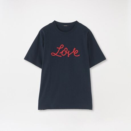 コード刺繍で模られた筆記体「LOVE」がを引くTシャツ