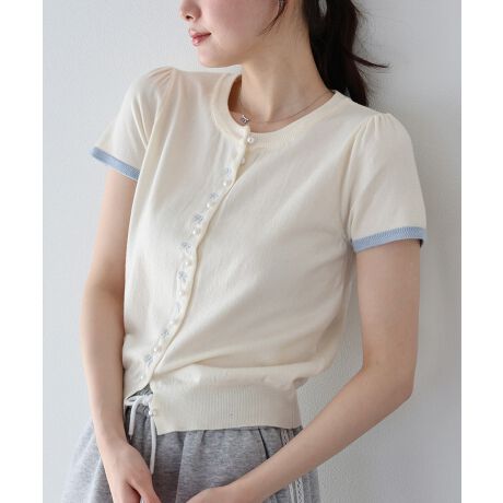 パールボタン×リボン刺繍が大人ガーリーな半袖ニットカーディガン