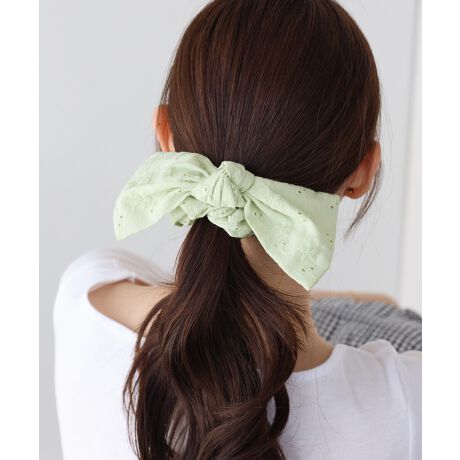 大きめで存在感のあるリボンが大人かわいいコットンレースを使用したシュシュ。