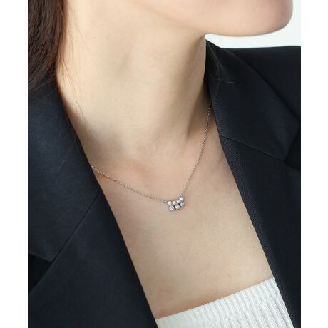 ”人口ダイヤモンド”とも呼ばれるダイヤモンドに似た輝きを放つ人工石のキュービックジルコニアと小粒のパールを緩やかな曲線を描くスマイルラインに連ねたネックレス。