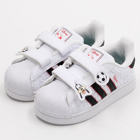 [型番:IH1744]アイコニックなシェルトゥデザイン、スリーストライプスを模したタイヤマークのグラフィック、ヒールサイドにディズニーピクサーのカーズのグラフィック、ディズニーピクサーのカーズのキャラクターを忠実に再現したカラーの面ファスナー式クロージャー、チェック柄グラフィック入りプルタブ