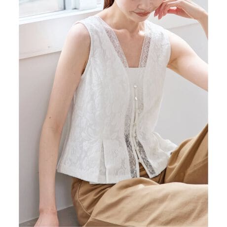 前立て部分には華奢なレーステープをあしらい、さりげない抜け感をプラスしています。