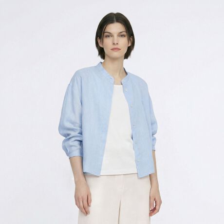 汗ばむ季節も快適に着られるシャンブレー素材のスタンドカラーブラウスです。ナチュラルな霜降り感と光沢感がポイント、カジュアルときれいめのいいとこ取りが楽しめます。ロールアップのアレンジもできる長袖丈、ボタンを留めて着るのはもちろん手持ちのTシャツやカットソーの上から羽織りとしても着られるアイテムです。