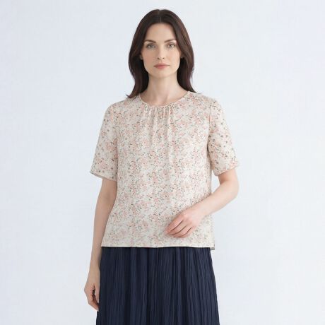 軽やかに小花がちりばめられたリバティプリントのカットソー。鎖骨が見え隠れするシャーリング入りのラウンドネックで、ほんのりフェミニンな表情に。柔らかく肌触りの良いギルドジャージーを使用しており、適度な伸縮性があるため動きやすく快適。身頃はゆとりをもたせているため、肌離れがよく体型もカバーできます。