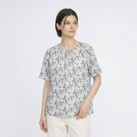軽やかに小花がちりばめられたリバティプリントのカットソー。鎖骨が見え隠れするシャーリング入りのラウンドネックで、ほんのりフェミニンな表情に。柔らかく肌触りの良いギルドジャージーを使用しており、適度な伸縮性があるため動きやすく快適。身頃はゆとりをもたせているため、肌離れがよく体型もカバーできます。