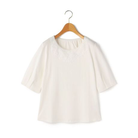 レース使いが華やかなカットソー。広めのラウンドネックでデコルテをきれいに見せる一方、アームホールはコンパクトにつめて1枚でも着やすく調整しています。綿100%のジャージー素材を使用しており、柔らかくやさしい着心地。あらゆるボトムスに合わせやすく、カジュアルにもエレガントにも着こなせます。