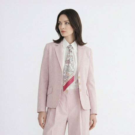 [型番:72263130601]爽やかなスタイリングがかなう、これからの季節にぴったりなサッカーストライプ柄のジャケットです。ウエストを絞ったシルエットで女性らしさをプラス、袖は折り返しても着られるデザインに仕上げました。手持ちのアイテムとはもちろん、同柄のワンピースやパンツとセットでそろえるのもおすすめです。※商品画像はサンプルを使用しているため、実際の商品と色味などの仕様が異なる場合がございます。予めご了承ください。model:T.167着用サイズ:38
