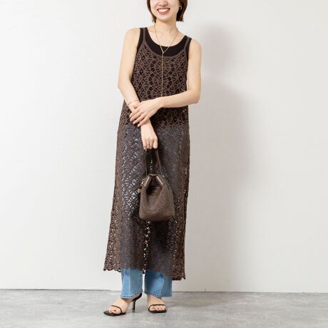 ・トレンドのクロッシェ調の立体感のあるレース素材を使用したヘルシーなキャミワンピース