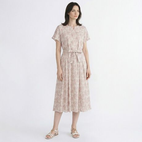 フェミニンな着こなしがかなう、Liberty Print柄のワンピースです。衿元に抜け感を作るキーネック、胸元のギャザーやスカート部分のタックプリーツなどディテールにもこだわりました。くびれコンシャスなリボンベルトもポイント、あわせるアイテム次第でカジュアルにもキレイ目にも着られるアイテムです。