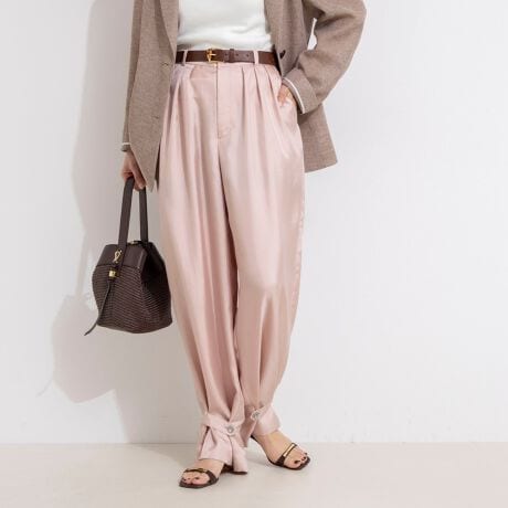 ・シルクのような軋みと肌触りを表現したナチュラルシルキーなサテンを使用したタックパンツ