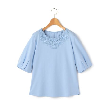 レース使いが華やかなカットソー。広めのラウンドネックでデコルテをきれいに見せる一方、アームホールはコンパクトにつめて1枚でも着やすく調整しています。綿100%のジャージー素材を使用しており、柔らかくやさしい着心地。あらゆるボトムスに合わせやすく、カジュアルにもエレガントにも着こなせます。