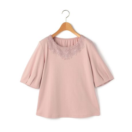 レース使いが華やかなカットソー。広めのラウンドネックでデコルテをきれいに見せる一方、アームホールはコンパクトにつめて1枚でも着やすく調整しています。綿100%のジャージー素材を使用しており、柔らかくやさしい着心地。あらゆるボトムスに合わせやすく、カジュアルにもエレガントにも着こなせます。