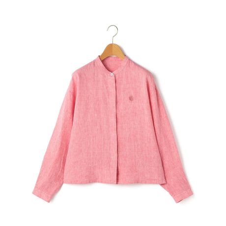 汗ばむ季節も快適に着られるシャンブレー素材のスタンドカラーブラウスです。ナチュラルな霜降り感と光沢感がポイント、カジュアルときれいめのいいとこ取りが楽しめます。ロールアップのアレンジもできる長袖丈、ボタンを留めて着るのはもちろん手持ちのTシャツやカットソーの上から羽織りとしても着られるアイテムです。