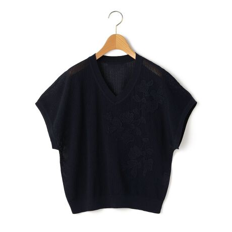 [型番:72263180661]爽やかなイメージ作りにぴったりのシアーメッシュニット。程よい透け感がボリュームのあるシルエットに軽やかな表情をプラスしています。体型カバーにも効果的で、フレンチスリーブなので肩周りも気になりません。さらに、フロントに施されたトーナルカラーのフラワー刺しゅうが、フェミニンな華やかさを演出します。※商品画像はサンプルを使用しているため、実際の商品と色味などの仕様が異なる場合がございます。予めご了承ください。