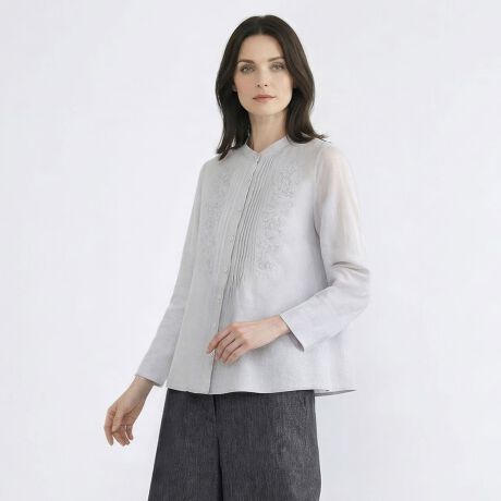 胸元にエンブロイダリーのフラワーモチーフをあしらったブラウスです。さらにピンタックプリーツでよりエレガンスに、これ1枚で非日常なワンランク上の着こなしがかないます。前開きデザインでボタンを留めて着るのはもちろん羽織るのもこなれ感があっておすすめ、ほど良い透け感のある軽やかな素材も魅力です。