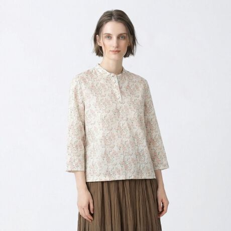 小花がちりばめられたリバティプリントのカットソー。バンドカラー付きなので、カジュアルすぎず決めすぎない着こなしが楽しめます。生地は柔らかく肌触りの良いギルドジャージーを使用しており、適度な伸縮性があるため動きやすく快適。また、手首がのぞく7分袖が華奢さを印象付けながら、装いに程よい抜け感を与えます。