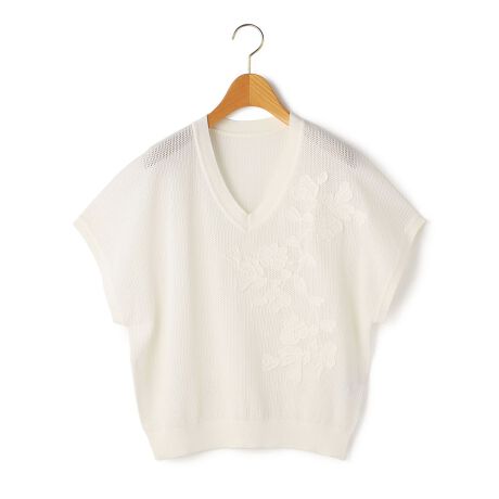 [型番:72263280661]爽やかなイメージ作りにぴったりのシアーメッシュニット。程よい透け感がボリュームのあるシルエットに軽やかな表情をプラスしています。体型カバーにも効果的で、フレンチスリーブなので肩周りも気になりません。さらに、フロントに施されたトーナルカラーのフラワー刺しゅうが、フェミニンな華やかさを演出します。※商品画像はサンプルを使用しているため、実際の商品と色味などの仕様が異なる場合がございます。予めご了承ください。