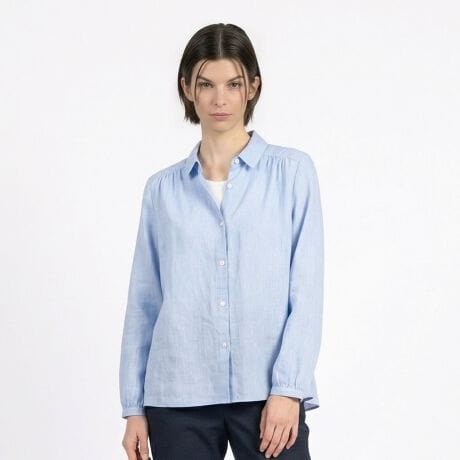 汗ばむ季節も快適に着られるシャンブレー素材のシャツカラーブラウスです。ナチュラルな光沢感と霜降り感がポイント、カジュアルときれいめのいいとこ取りが楽しめます。ロールアップのアレンジもできる長袖丈、ボタンを留めて着るのはもちろん手持ちのTシャツやカットソーの上から羽織りとしてあわせるのもおすすめです。