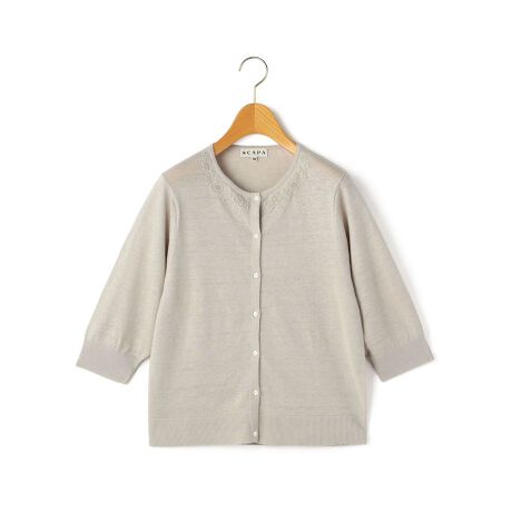 [型番:72263280651]ネックラインに沿って刺しゅうの花を咲かせたカーディガン。綿糸ならではのナチュラルな膨らみが、優しげな女性像を描き出します。身頃は麻100%ニットを使用しており、ほんのり透け感のある仕上がり。さらりとしたドライな肌触りで、日よけや空調対策にもおすすめです。袖も7分丈にして軽やかさを演出しました。※商品画像はサンプルを使用しているため、実際の商品と色味などの仕様が異なる場合がございます。予めご了承ください。