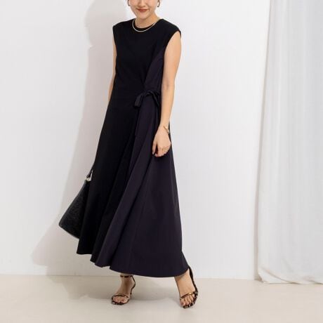 ・カットソーと布帛の異素材切り替えが目を引く、デザイン性の高いワンピース