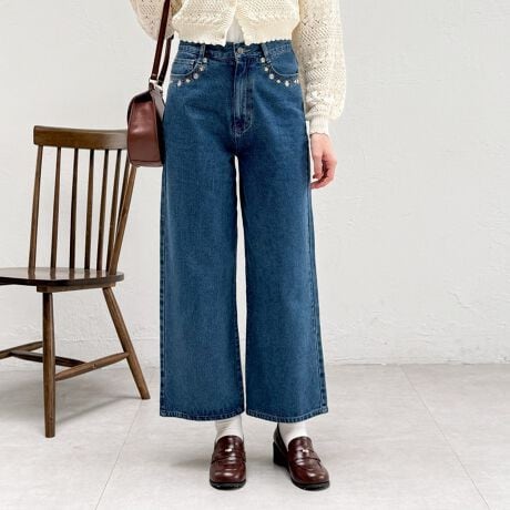 ポケット周りにあしらった小花刺繍がキュートなデニムパンツ