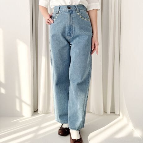 ポケット周りにあしらった小花刺繍がキュートなデニムパンツ