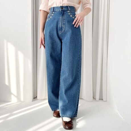 ポケット周りにあしらった小花刺繍がキュートなデニムパンツ