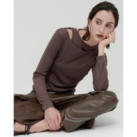 からだのラインを綺麗にみせる細いリブと、程よい透け感のシアーがヘルシーかつモードな印象。肩の開きがモダンなアクセントに。