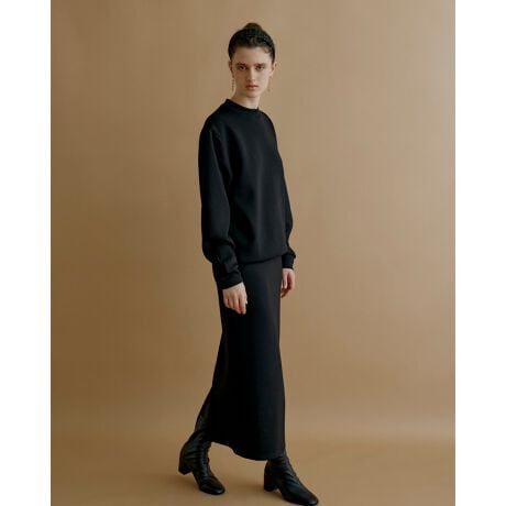 同素材のCUT TIGHT SKIRTと合わせてセットアップとして着用し、ジュエリーを合わせれば食事会やお呼ばれの場にもふさわしいスタイルが完成します。