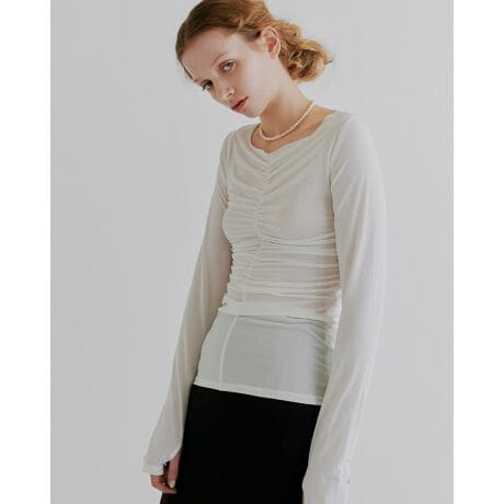 しっとりとした素材の落ち感は、ギャザーデザインとの相性が良く、程よいフィット感でボディラインを拾いすぎず、着やせ効果も期待できます。