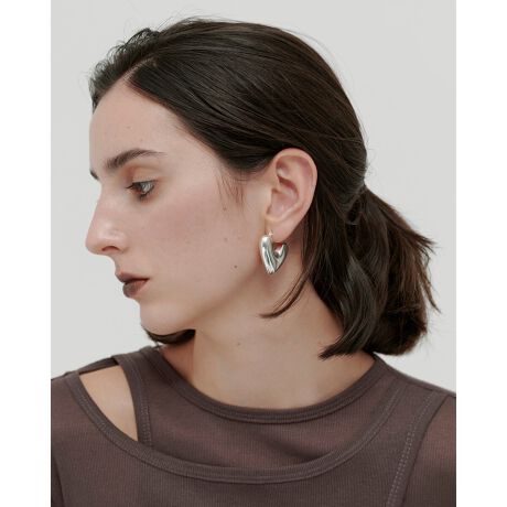 ぷっくりとした変形ハートのフープピアス。?ミニマルなフォルムに、光を映す鏡面仕上げで顔まわりを華やかに。