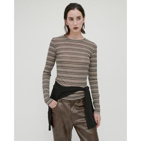 ランダムで繊細なボーダー柄がポイントのシンプルクルーネックトップス。