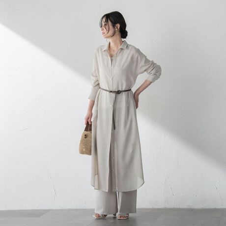 麻のようなナチュラルな表情と清涼感を持つ、麻調ボイル素材で仕立てたシャツワンピース。